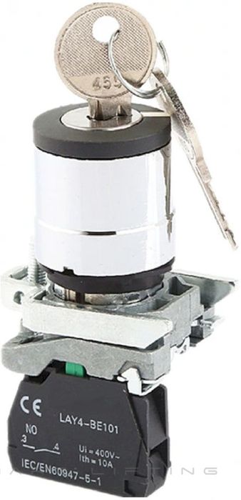 Key-switch to suit Simpro bin lifters and stackers, with 22mm metal barrel, two-position stay-put action, and two normally-open contact blocks.
