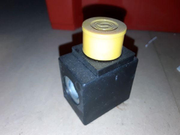 Lowering valve coil to suit legacy Simpro Dumpmaster bin lifters, with 220VAC coil, 3-prong DIN connector, and sealed plastic case.