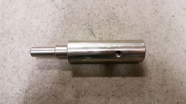 Main cradle axle for Simpro MegaDumper SS, two per machine. Machined 304 stainless-steel in three diameters, with chamfered edges and threaded cross-bore.